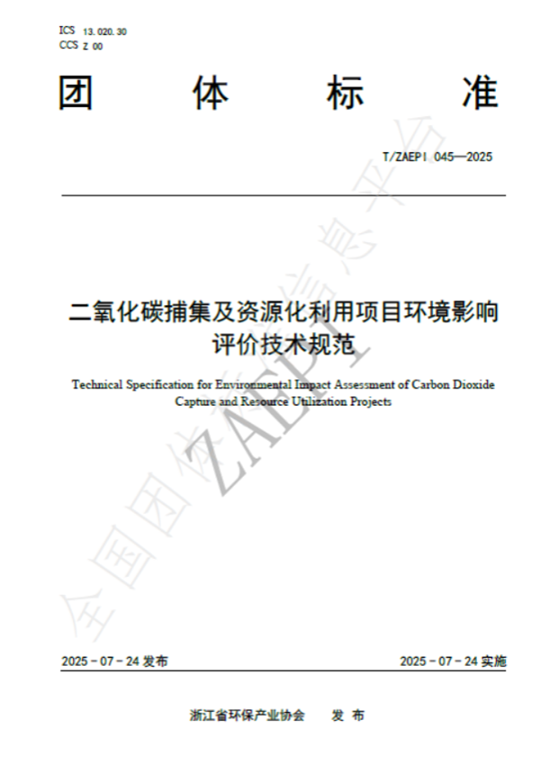 2025年7月24日,由浙江省環保集團生態環保研究院牽頭制定的《二氧化碳捕集及資源化利用項目環境影響評價技術規范》(T/ZAEPI 045-2025)團體標準正式發布并實施。該標準由浙江省環保產業協會歸口管理,聯合省內多家環保領域骨干企業共同起草,填補了工業領域二氧化碳捕集及資源化利用項目環評技術規范的空白。